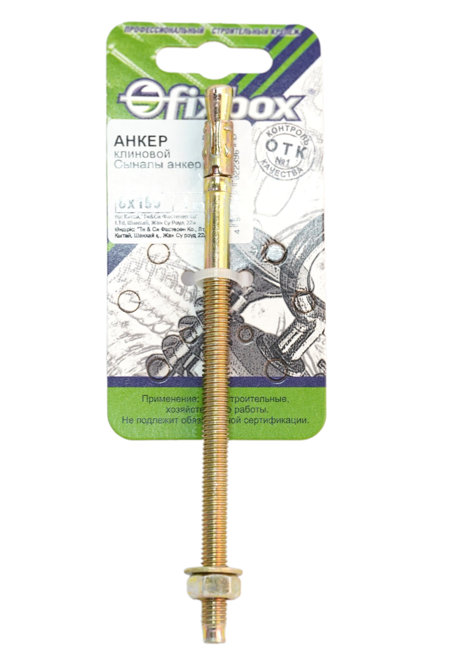 Анкер клиновой 8х150 (1 шт) Стройбат Применение: для ответственного монтажа тяжеловесных конструкций сквозным методом к бетону, камню, кирпичу. Является самым прочным из анкеров. Состоит из шпильки, имеющей метрическую резьбу с одной стороны и конусообразный элемент с другой, распорной втулки, шестигранной гайки в комплекте с шайбой.
